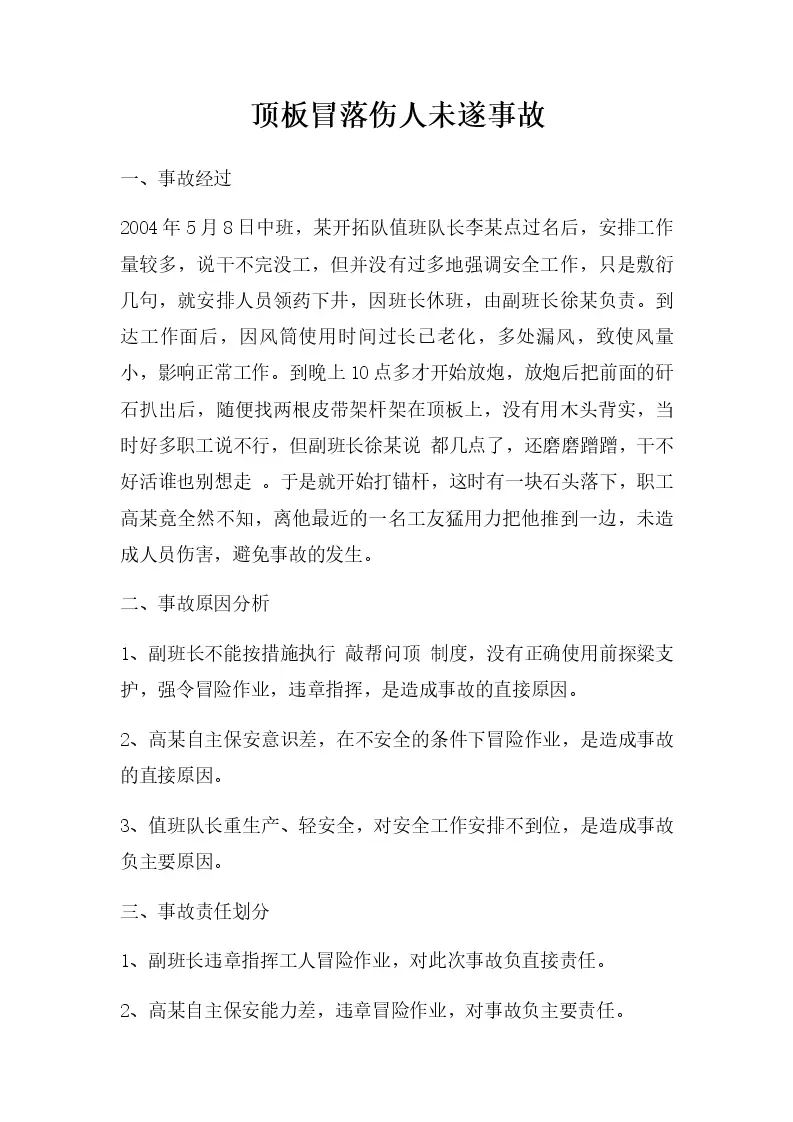 顶板冒落伤人未遂事故