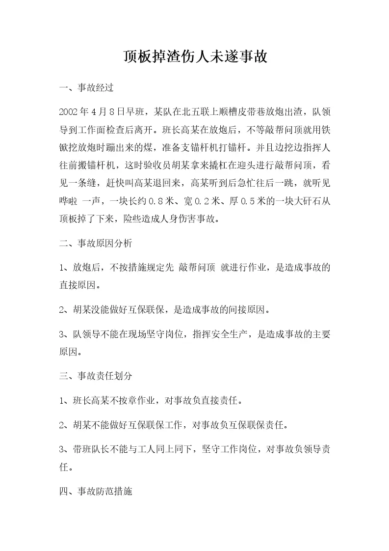 顶板掉渣伤人未遂事故