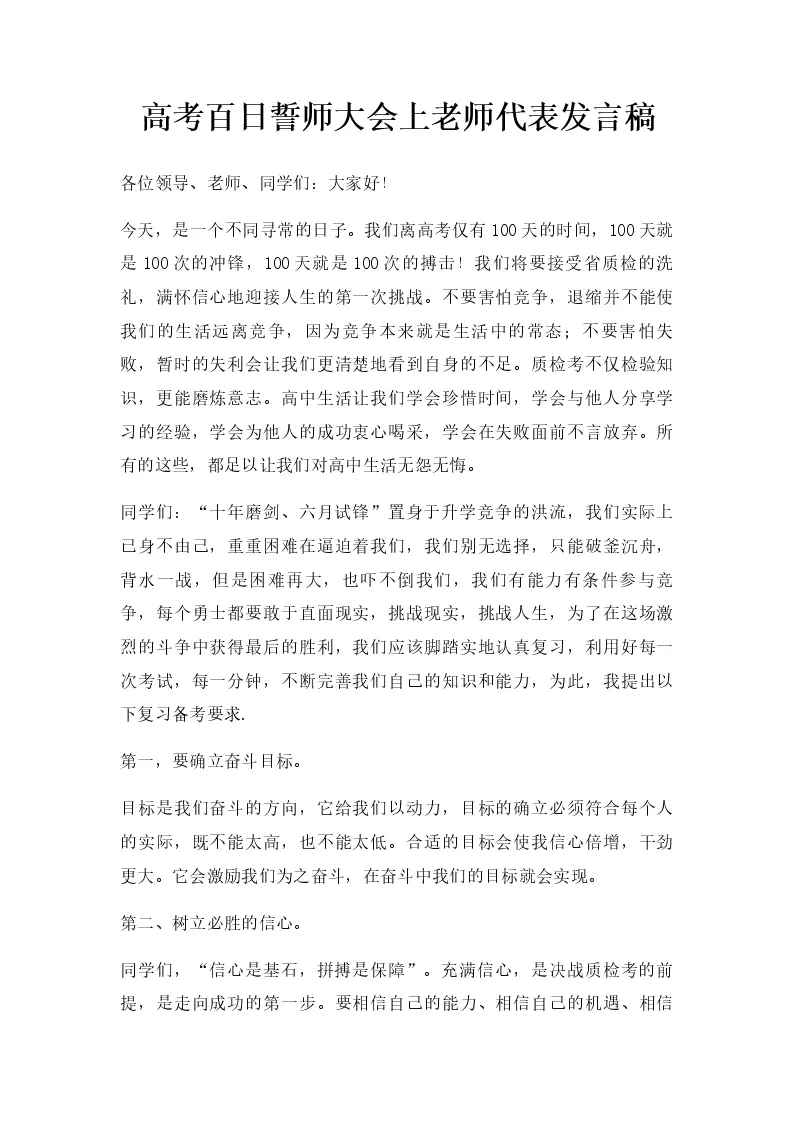 高考百日誓师大会上老师代表发言稿