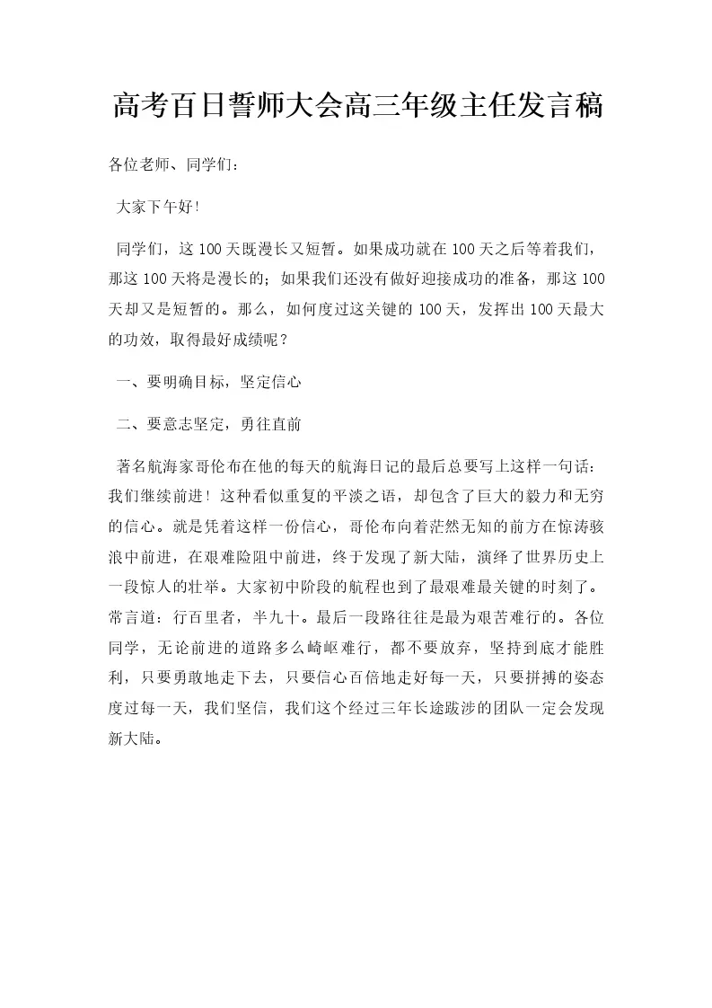 高考百日誓师大会高三年级主任发言稿