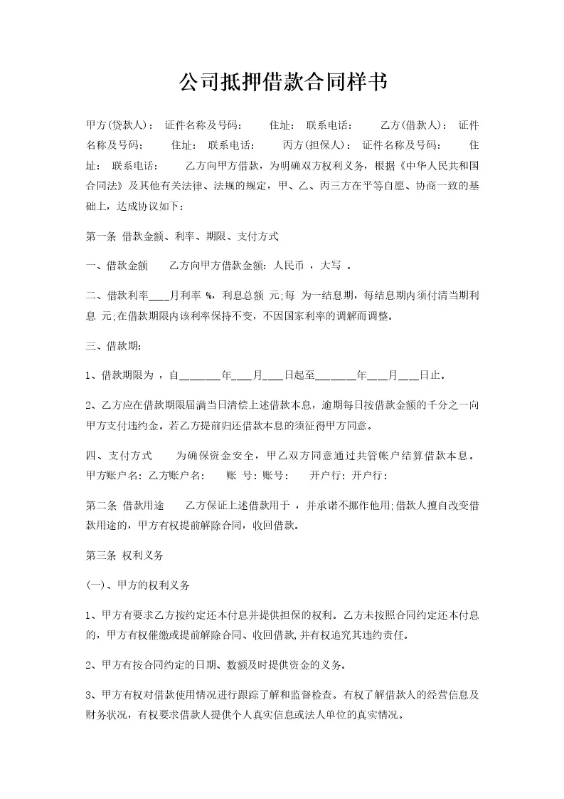 公司抵押借款合同样书
