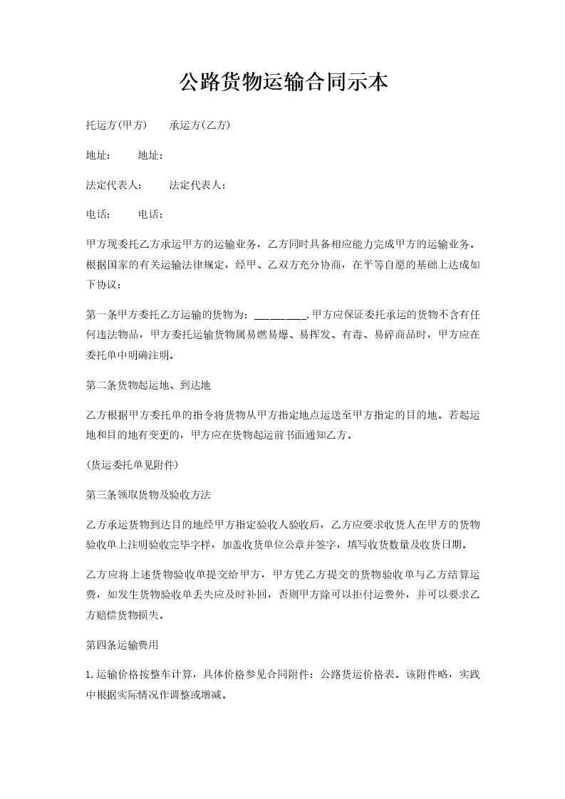 公路货物运输合同示本