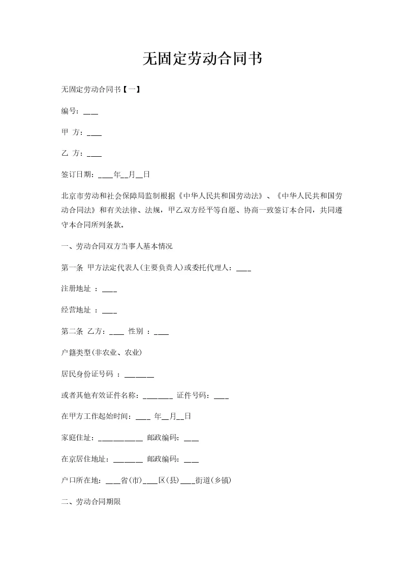无固定劳动合同书