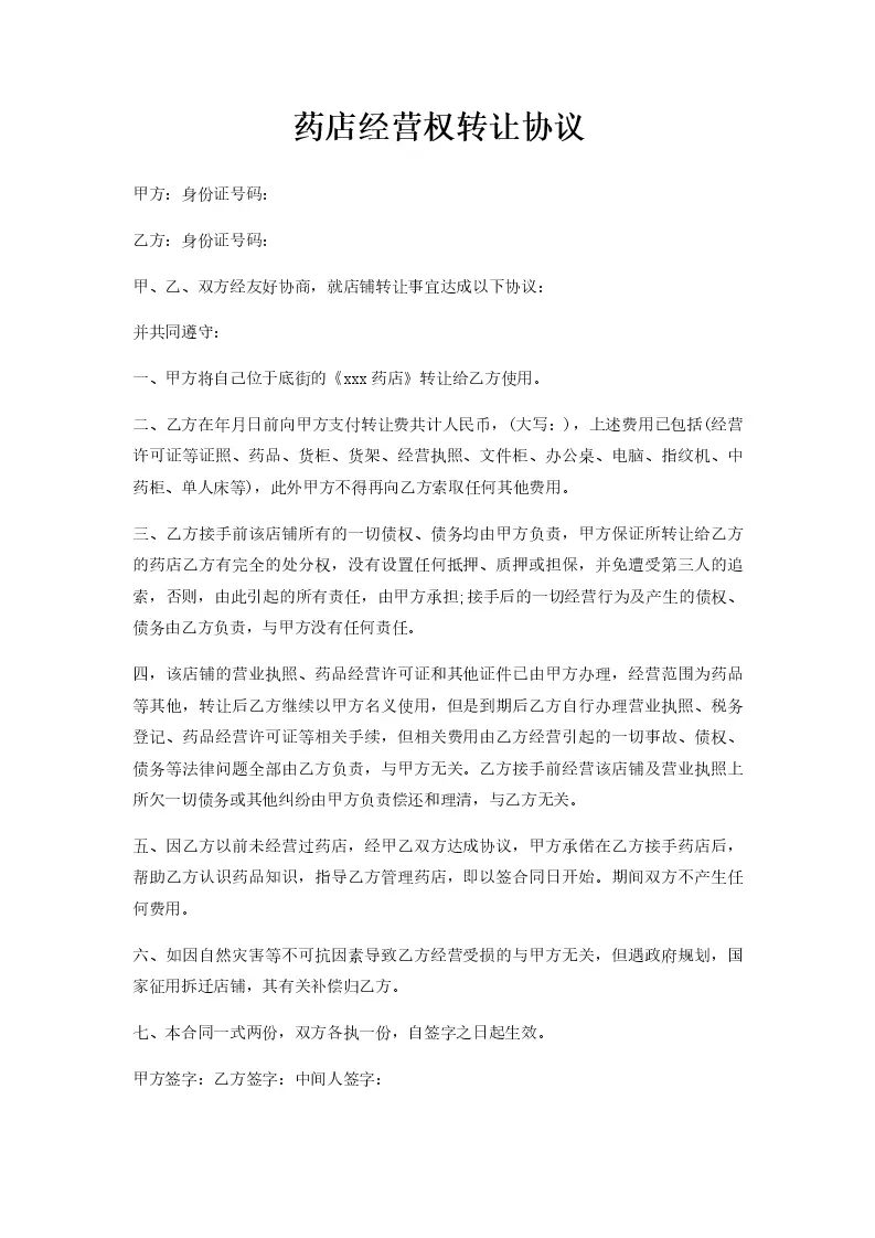 药店经营权转让协议