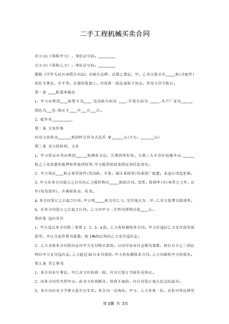 二手工程机械买卖合同