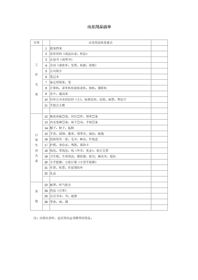 出差用品清单