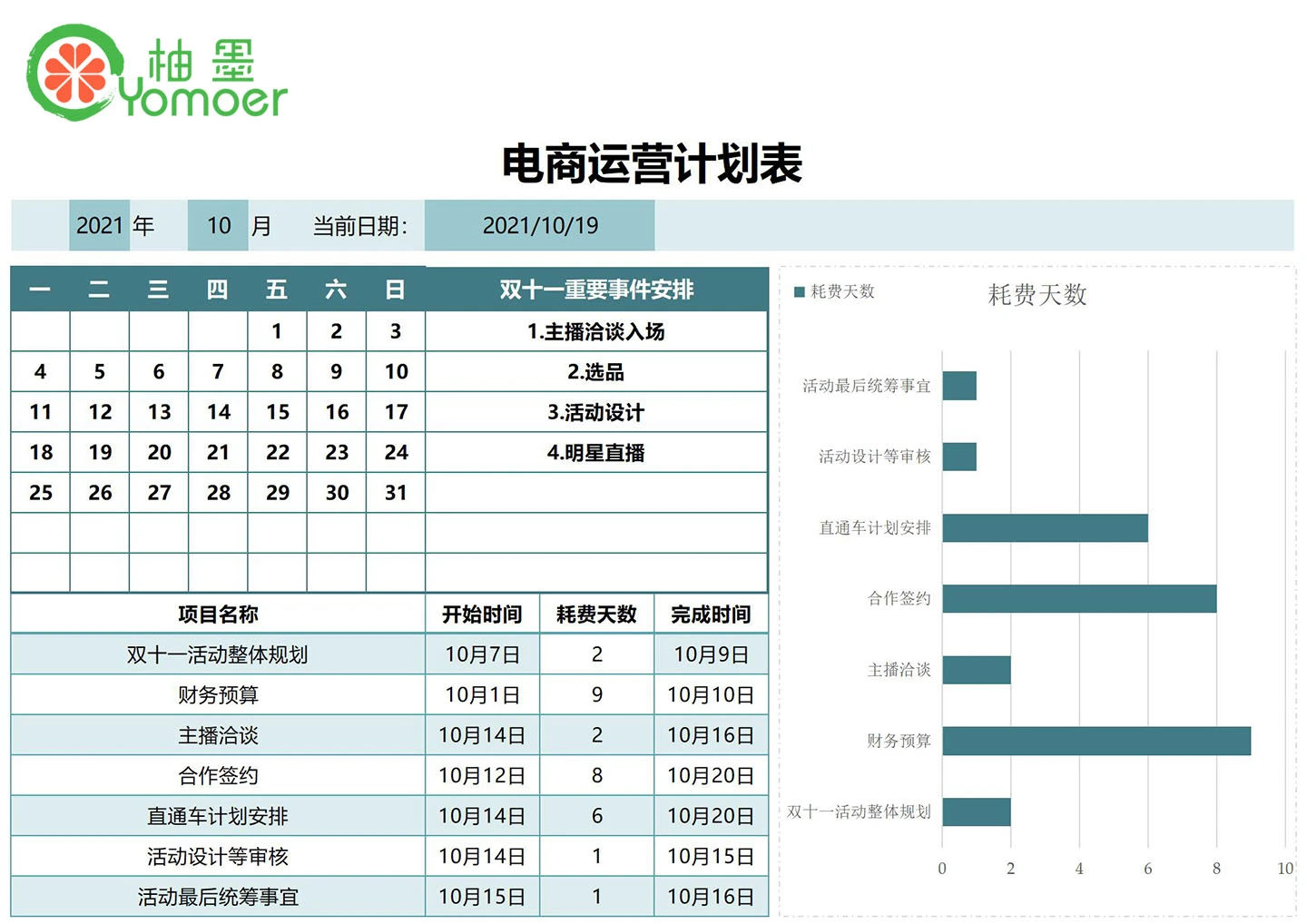 电商运营计划表(自动计算时间统计图表)