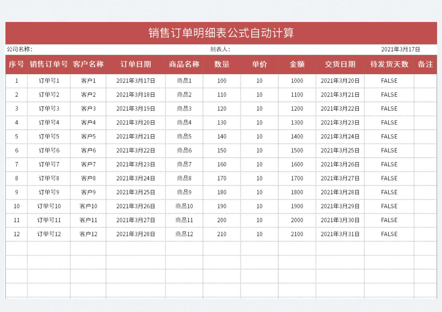 公式自动计算的销售订单明细表