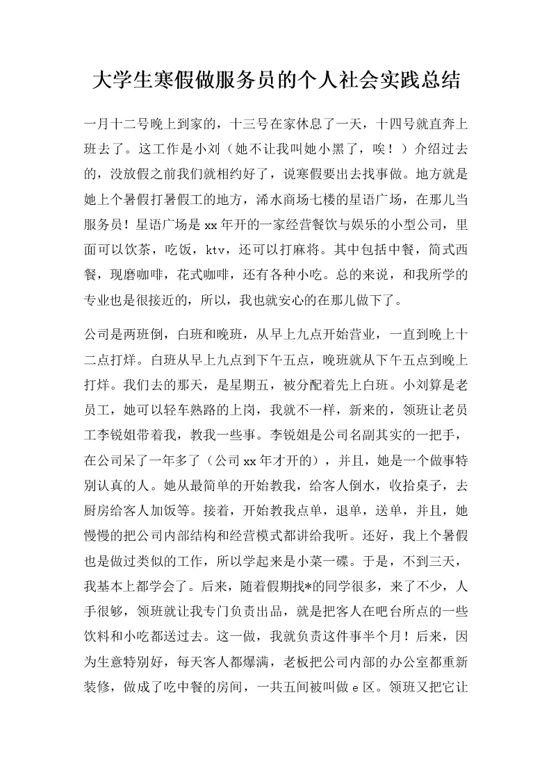 大学生寒假做服务员的个人社会实践总结