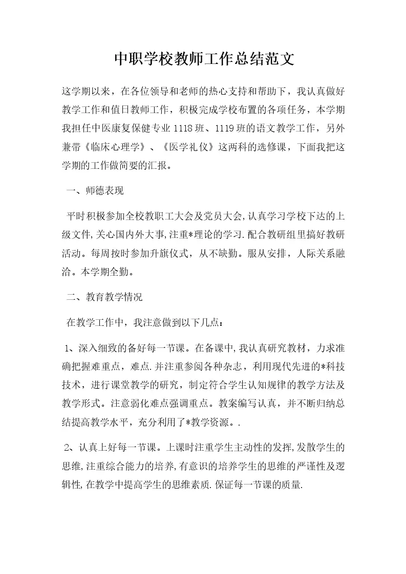 中职学校教师工作总结范文