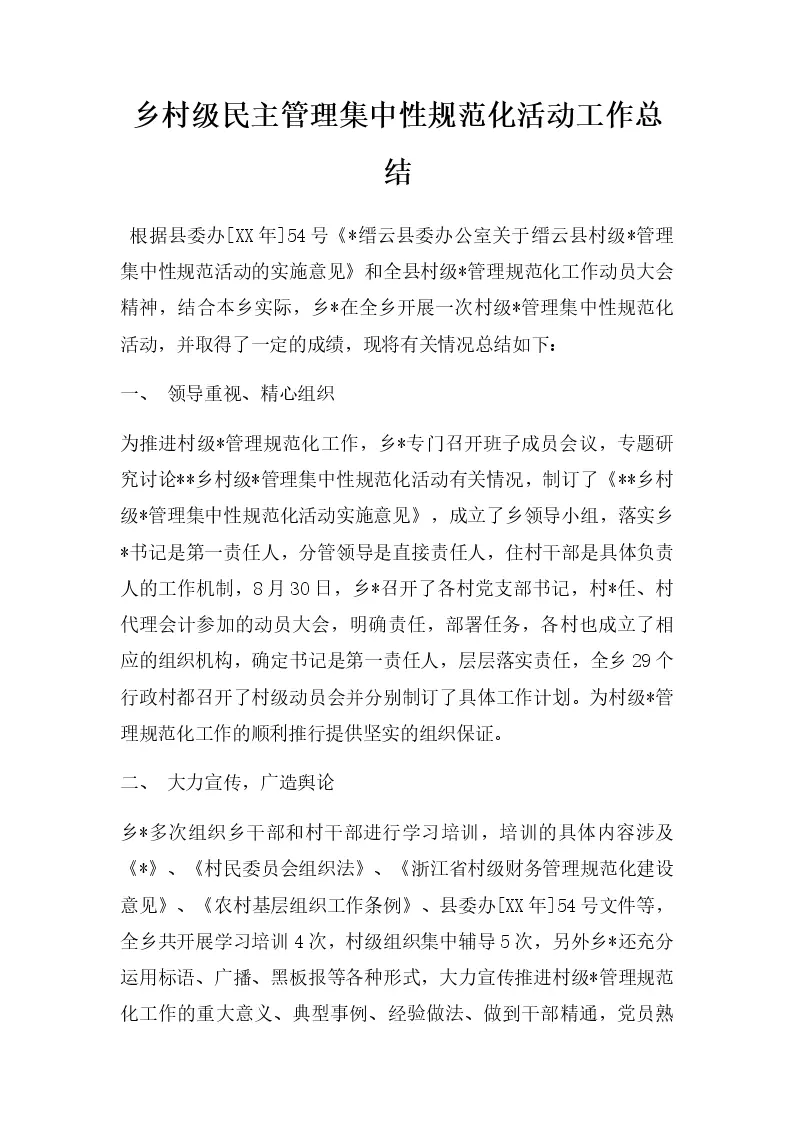乡村级民主管理集中性规范化活动工作总结