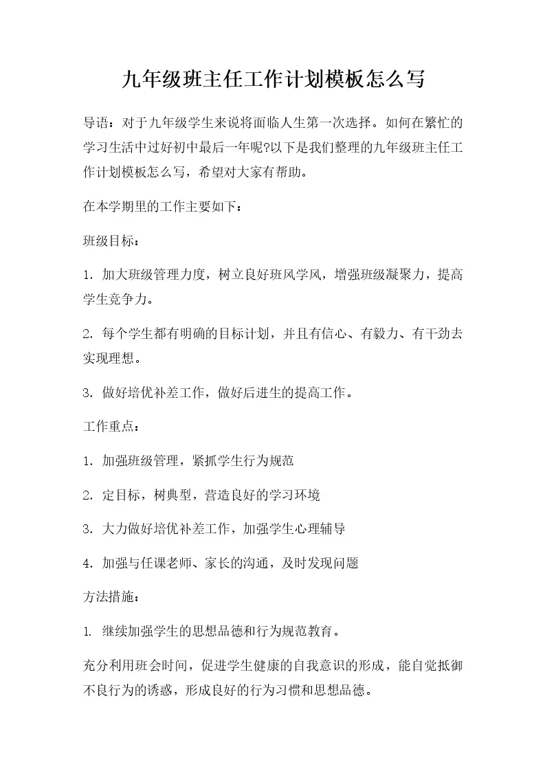 九年级班主任工作计划模板怎么写