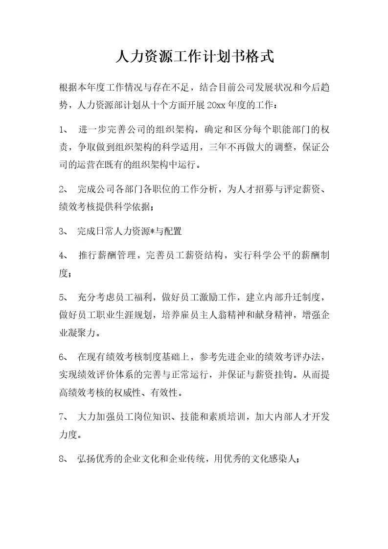 人力资源工作计划书格式