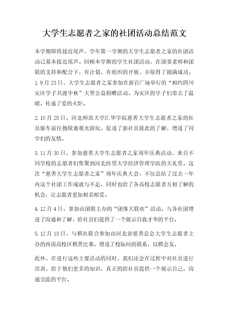 大学生志愿者之家的社团活动总结范文
