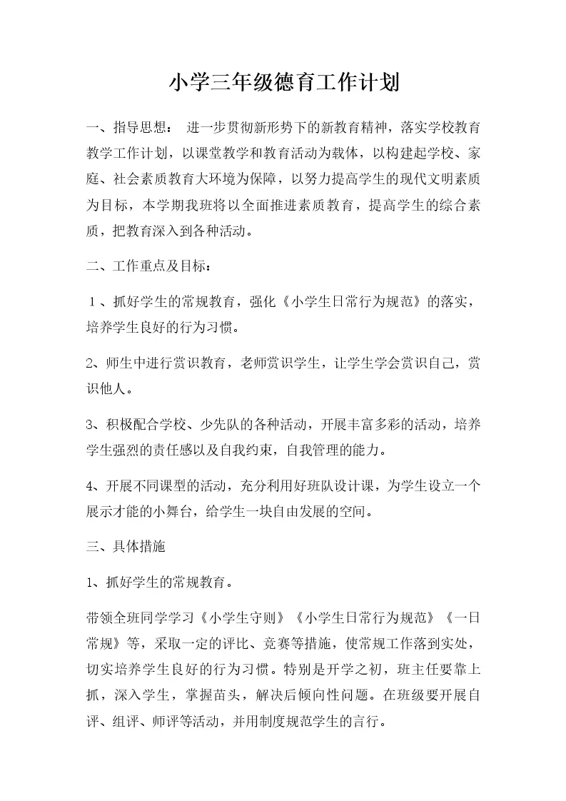 小学三年级德育工作计划