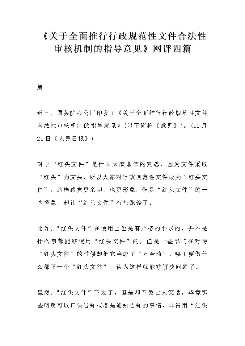 关于全面推行行政规范性文件合法性审核机制的指导意见网评四篇