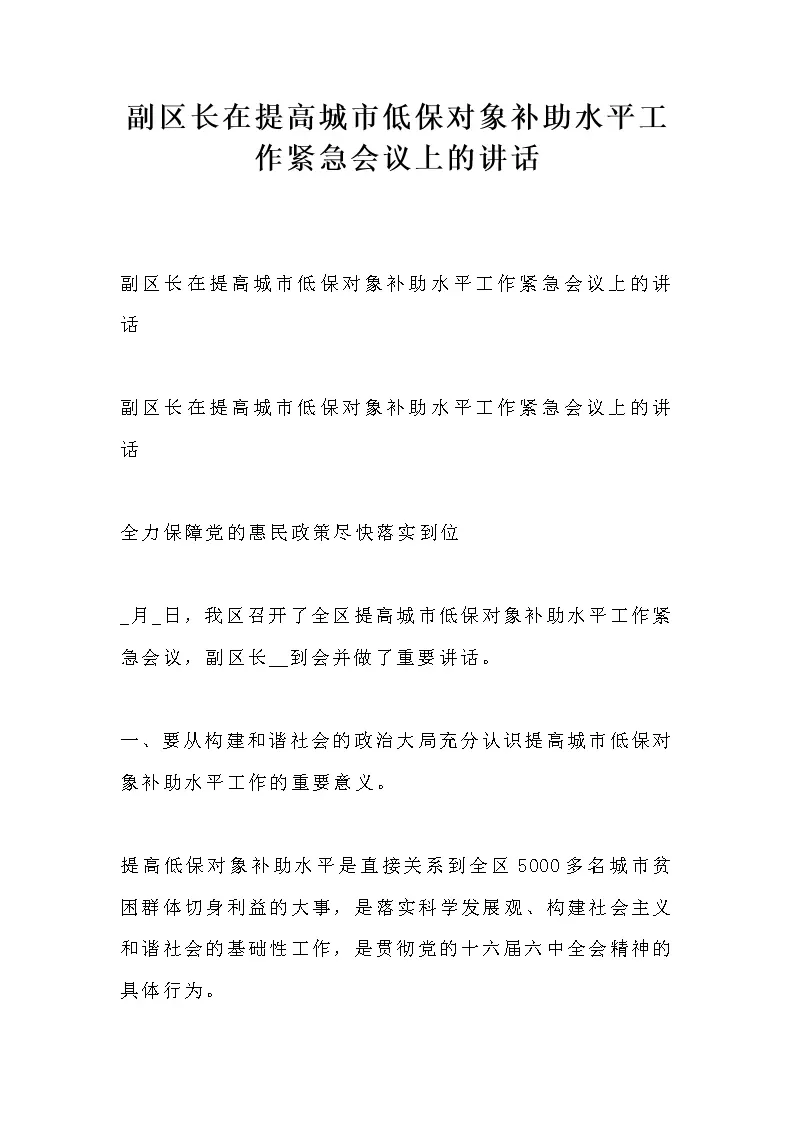 副区长在提高城市低保对象补助水平工作紧急会议上的讲话
