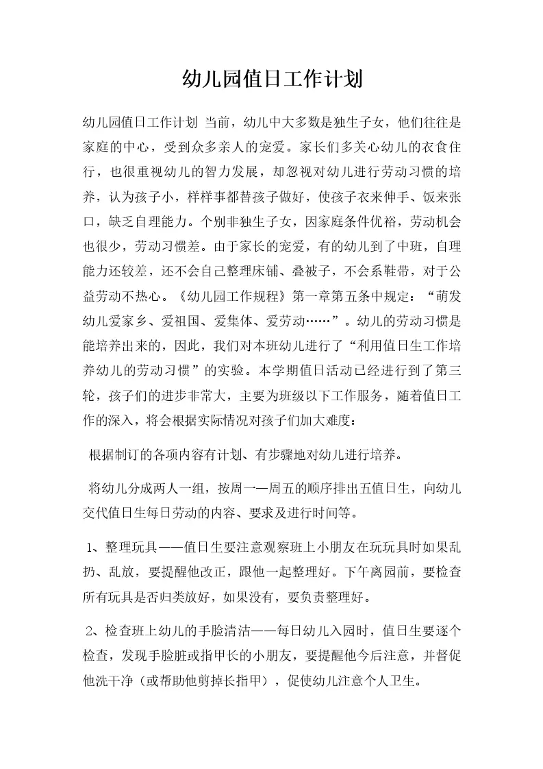 幼儿园值日工作计划