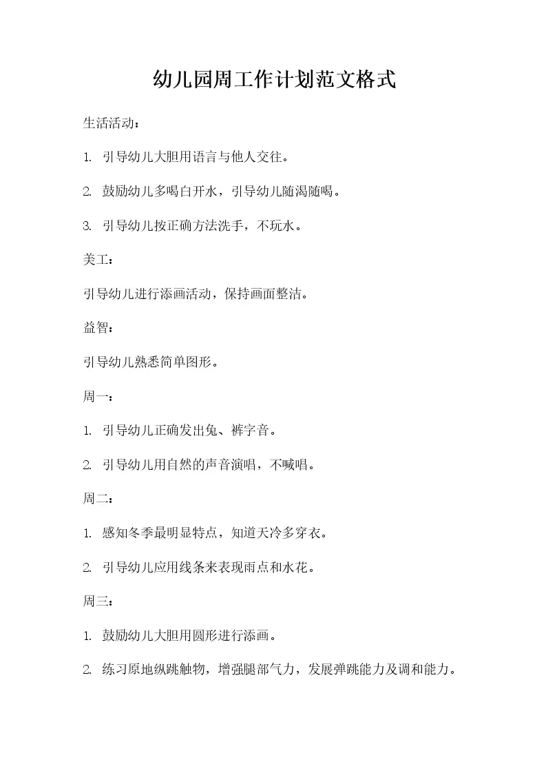 幼儿园周工作计划范文格式