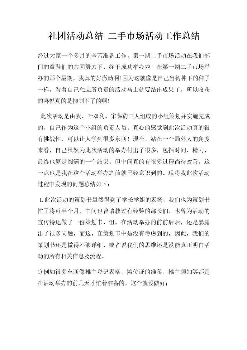 社团活动总结 二手市场活动工作总结