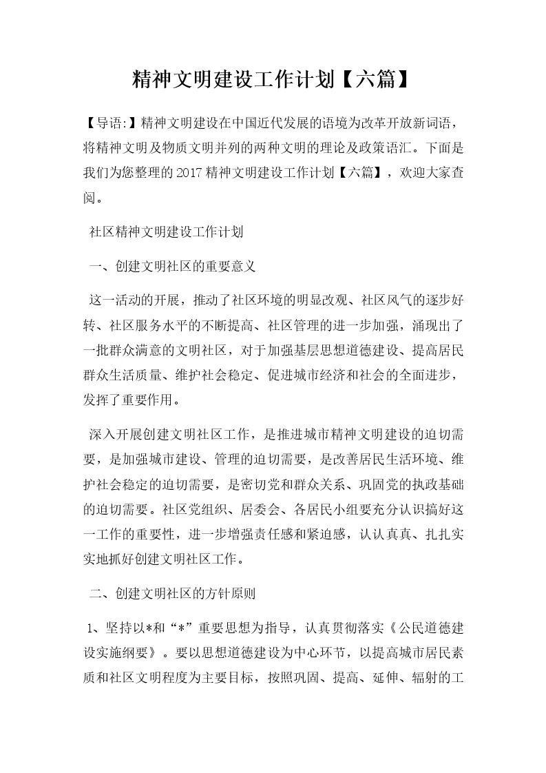 精神文明建设工作计划【六篇】