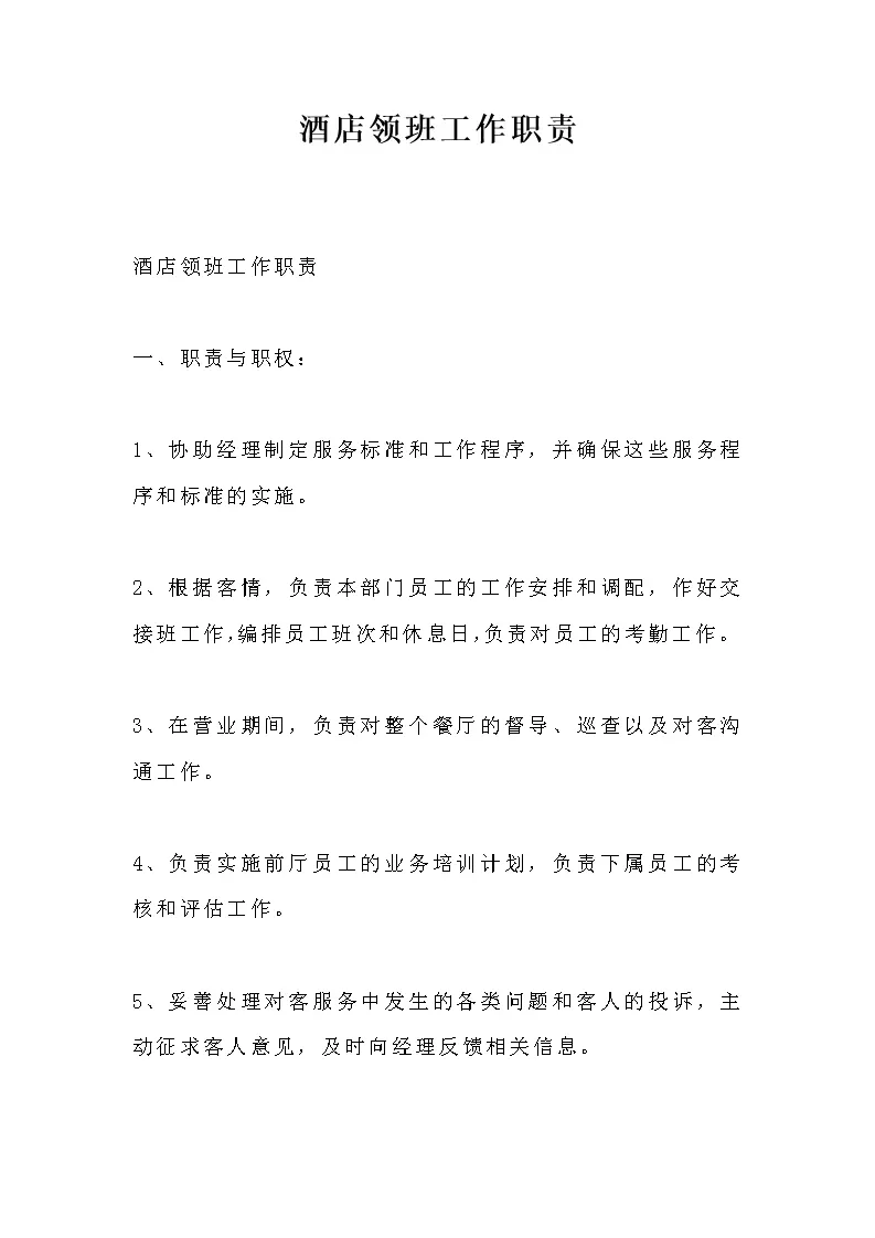 酒店领班工作职责