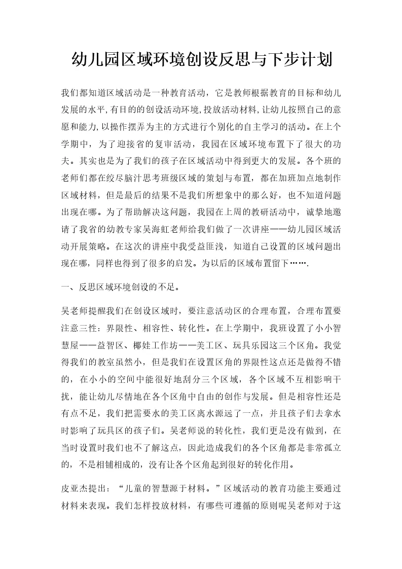 幼儿园区域环境创设反思与下步计划