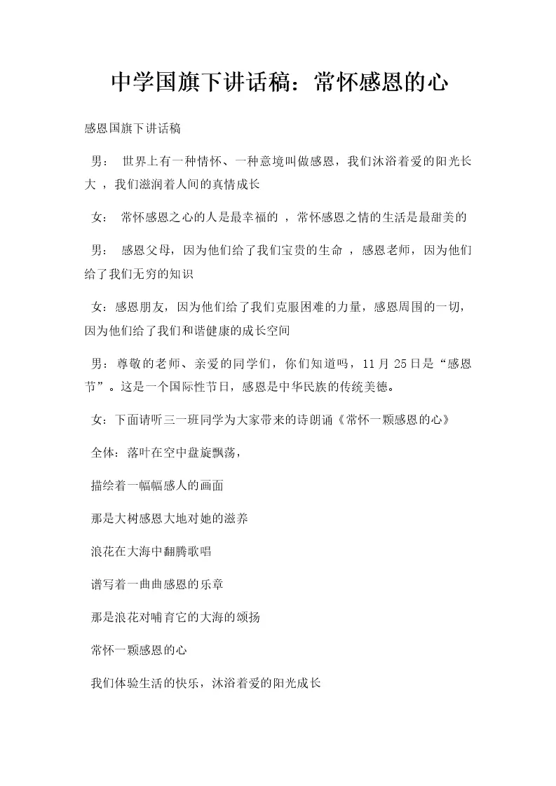 中学国旗下讲话稿:常怀感恩的心