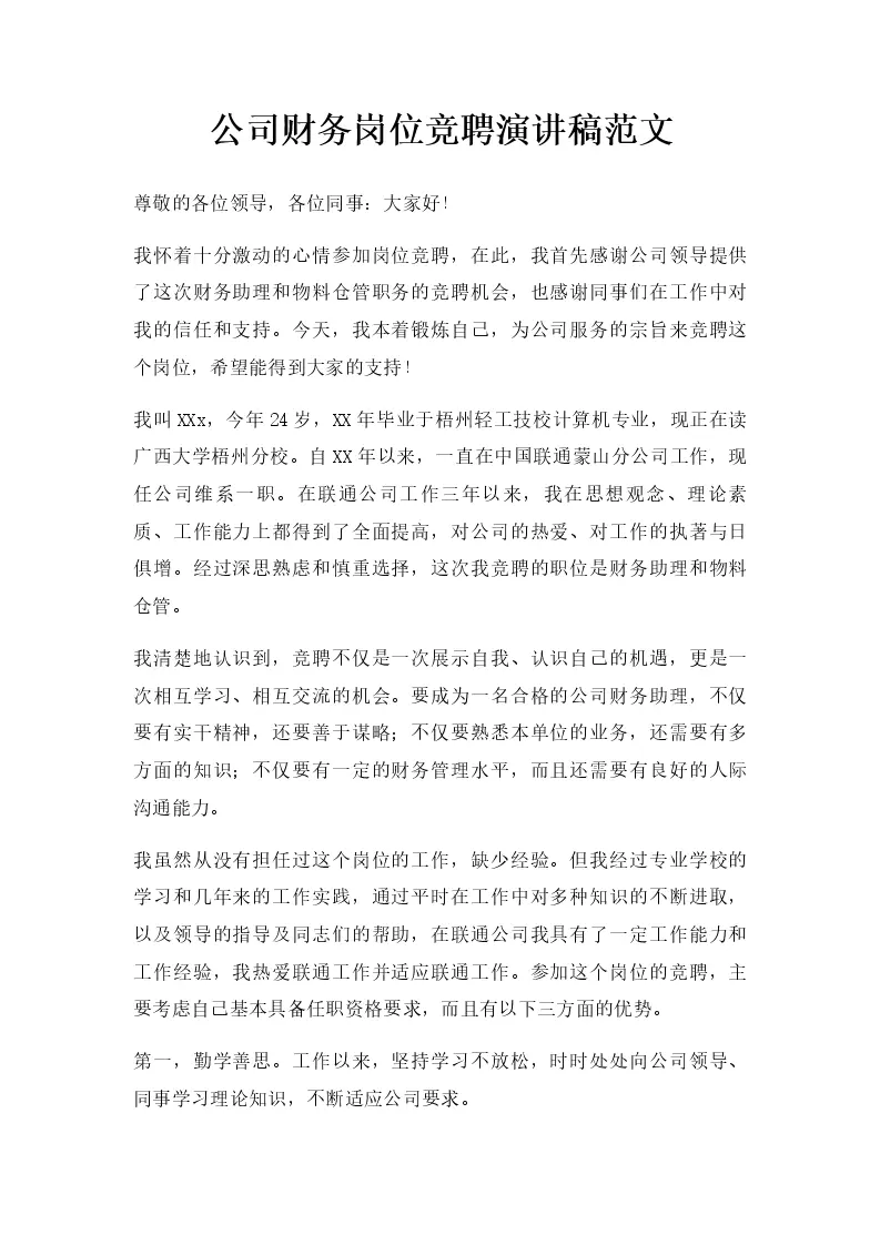 公司财务岗位竞聘演讲稿范文