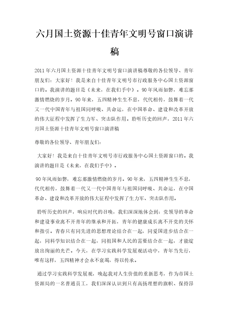 六月国土资源十佳青年文明号窗口演讲稿