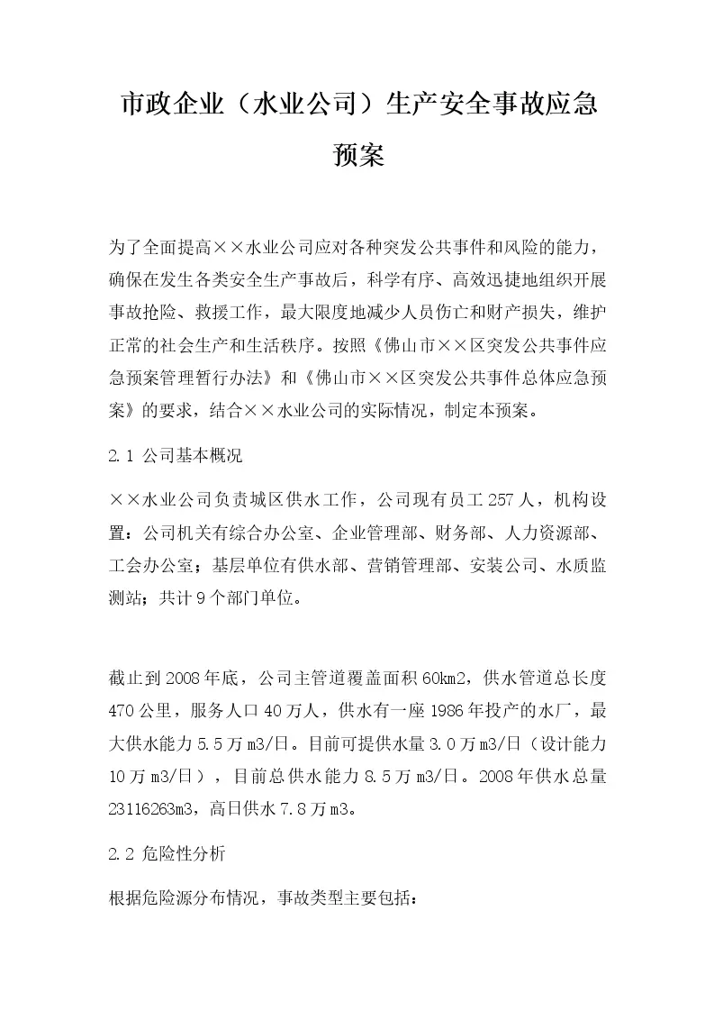 市政企业(水业公司)生产安全事故应急预案