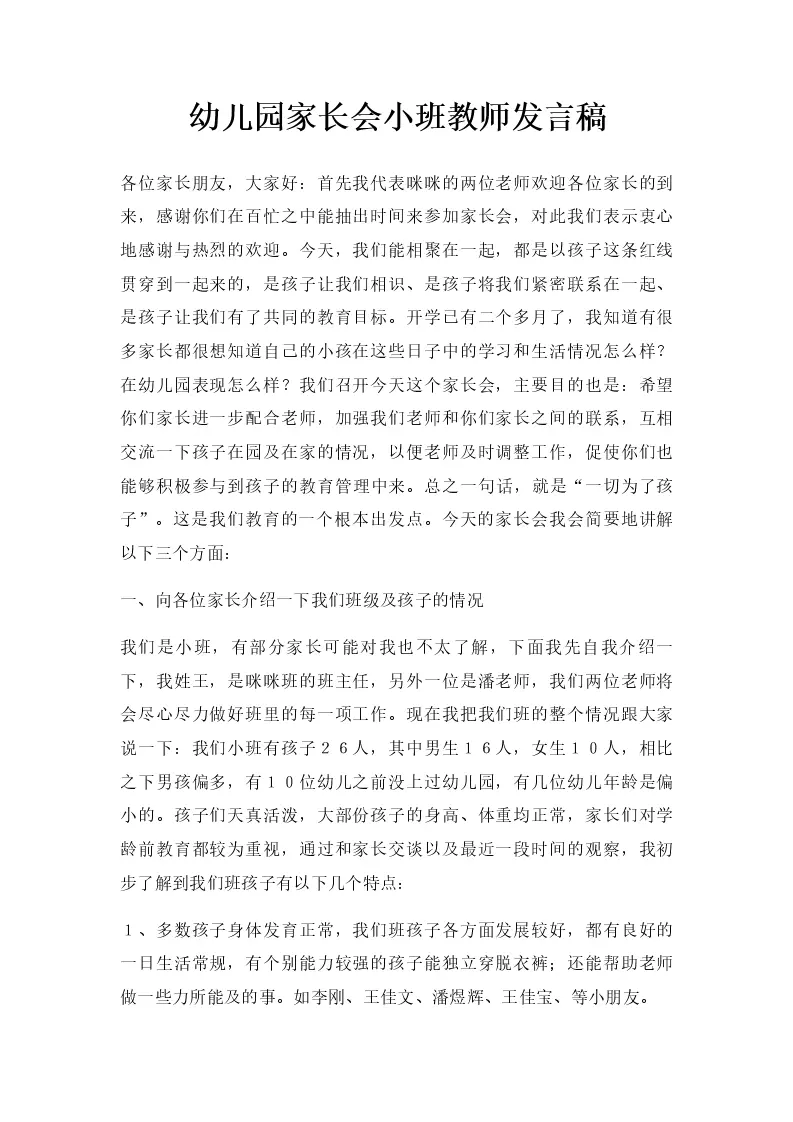 幼儿园家长会小班教师发言稿