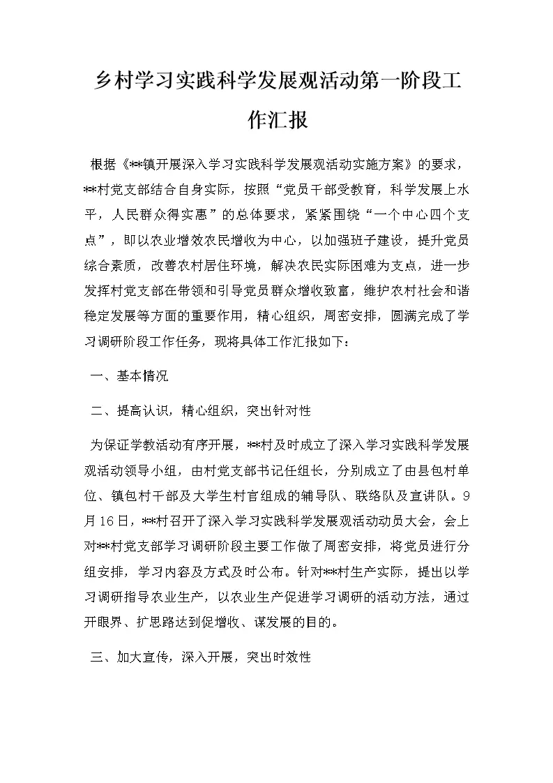乡村学习实践科学发展观活动第一阶段工作汇报
