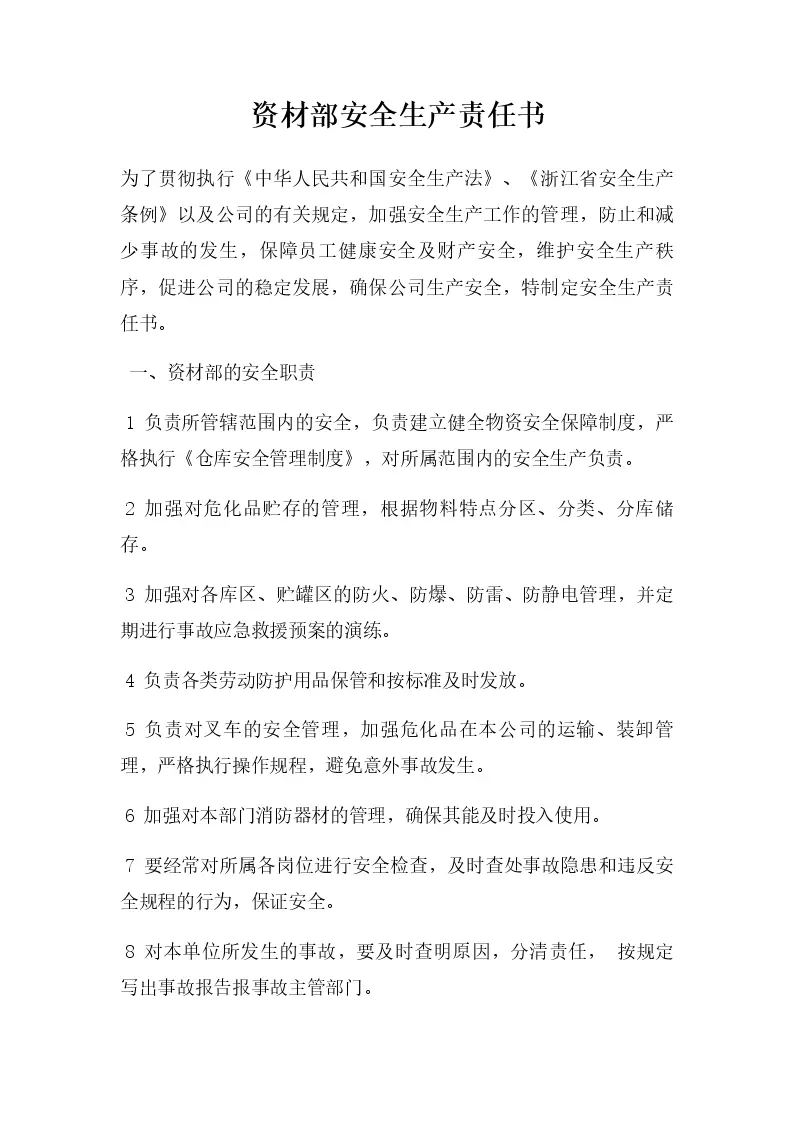 资材部安全生产责任书