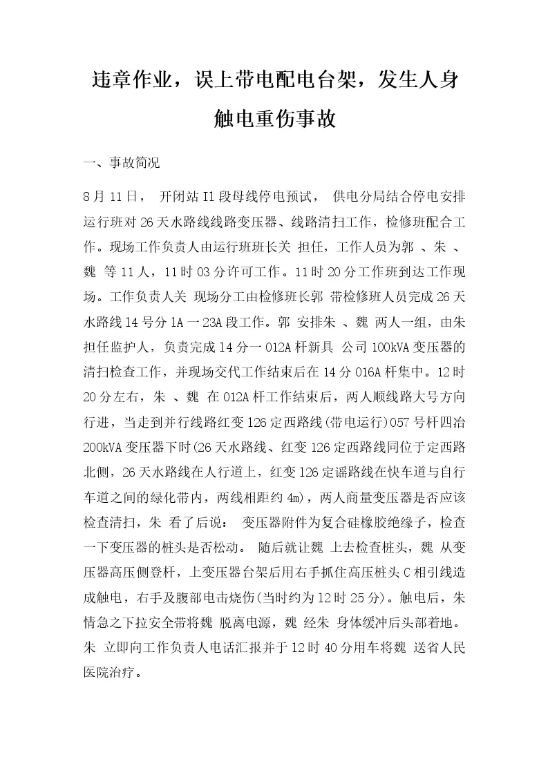 违章作业,误上带电配电台架,发生人身触电重伤事故