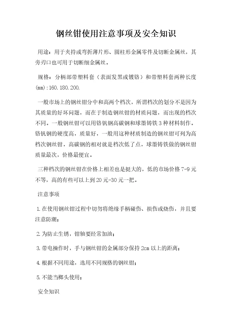 钢丝钳使用注意事项...