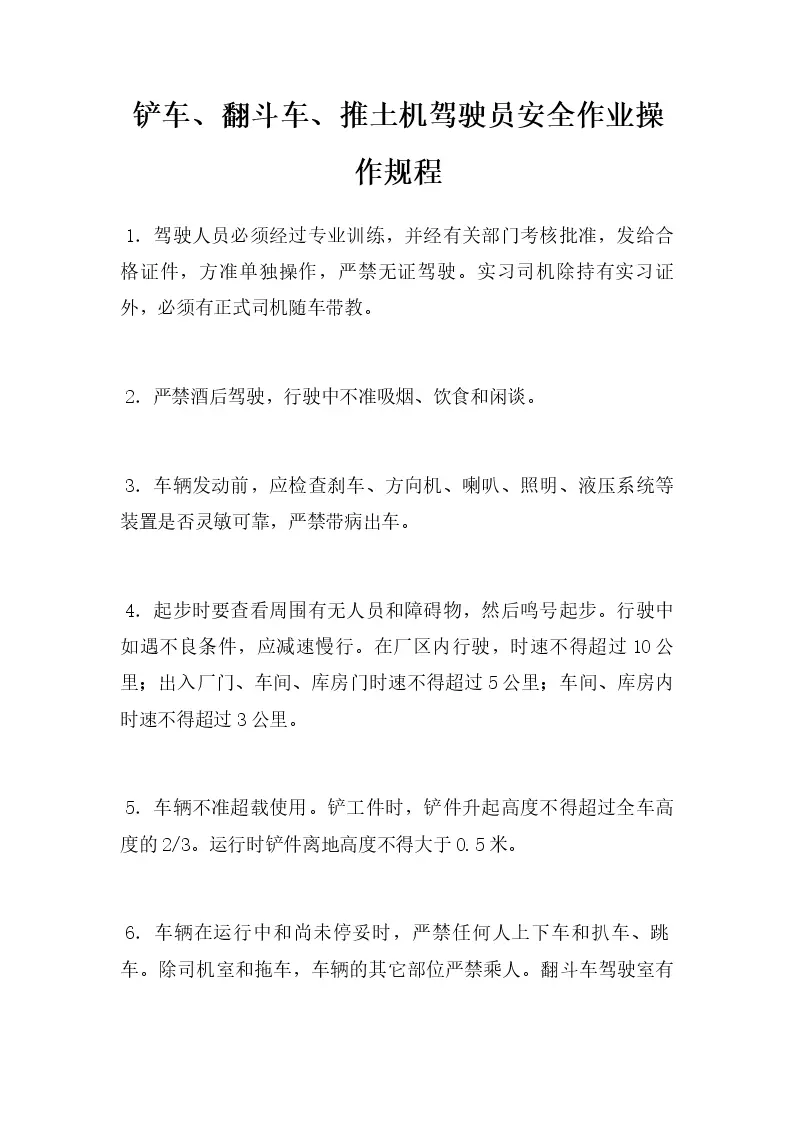 铲车、翻斗车、推土机驾驶员安全作业操作规程