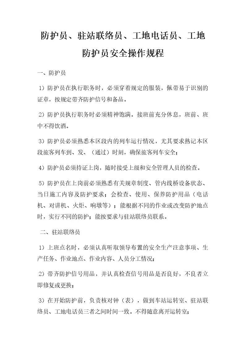 防护员、驻站联络员、工地电话员、工地防护员安全操作规程