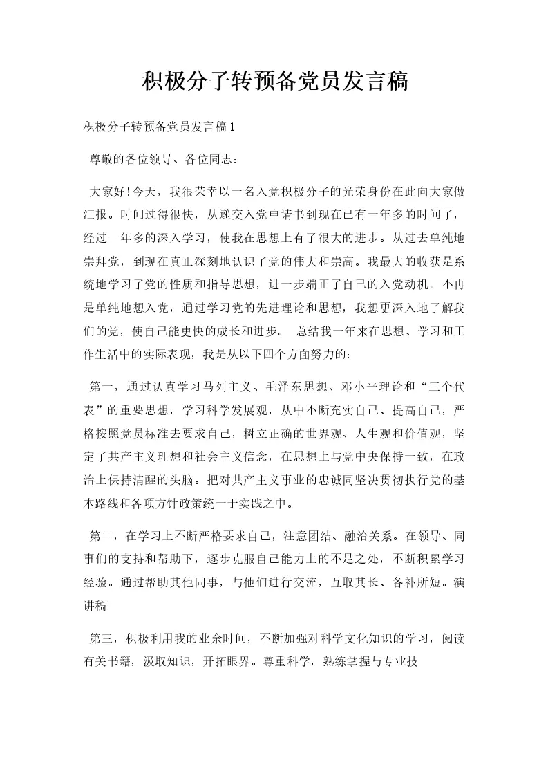 积极分子转预备党员发言稿
