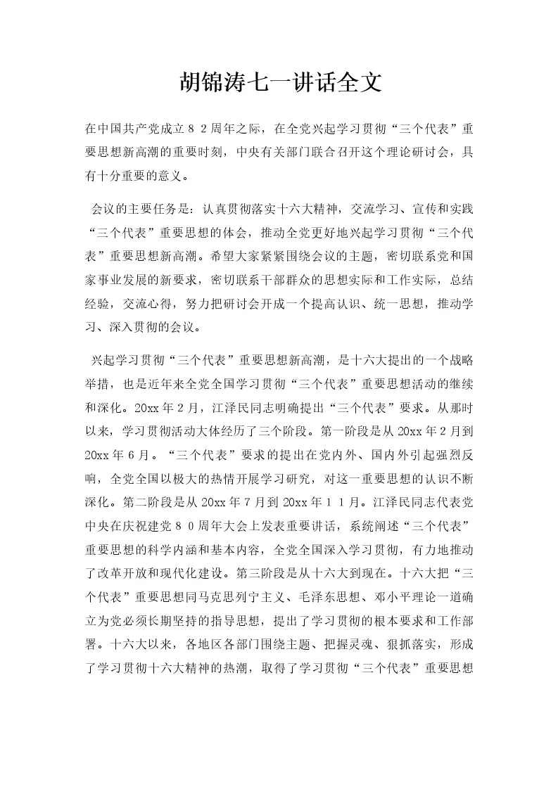 胡锦涛七一讲话全文