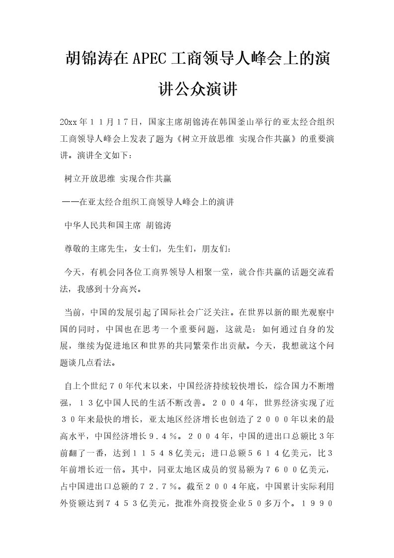 胡锦涛在APEC工商领导人峰会上的演讲公众演讲