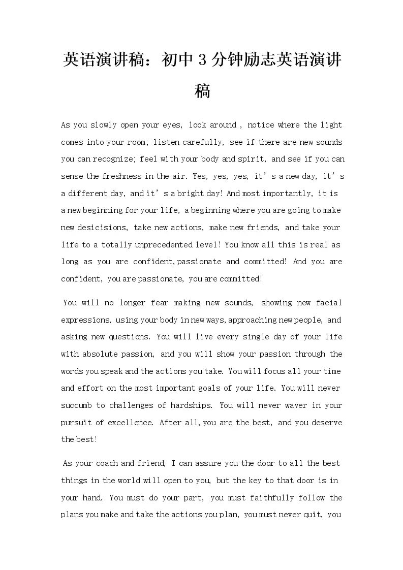 英语演讲稿:初中3分钟励志英语演讲稿