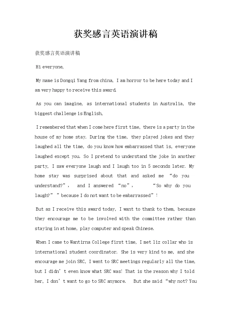 获奖感言英语演讲稿