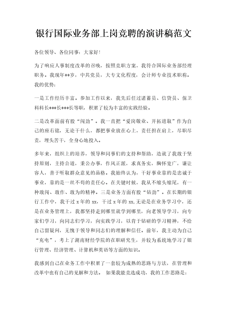银行国际业务部上岗竞聘的演讲稿范文