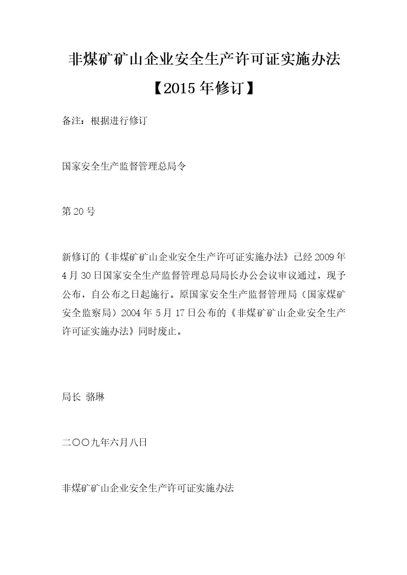 非煤矿矿山企业安全生产许可证实施办法【2015年修订】
