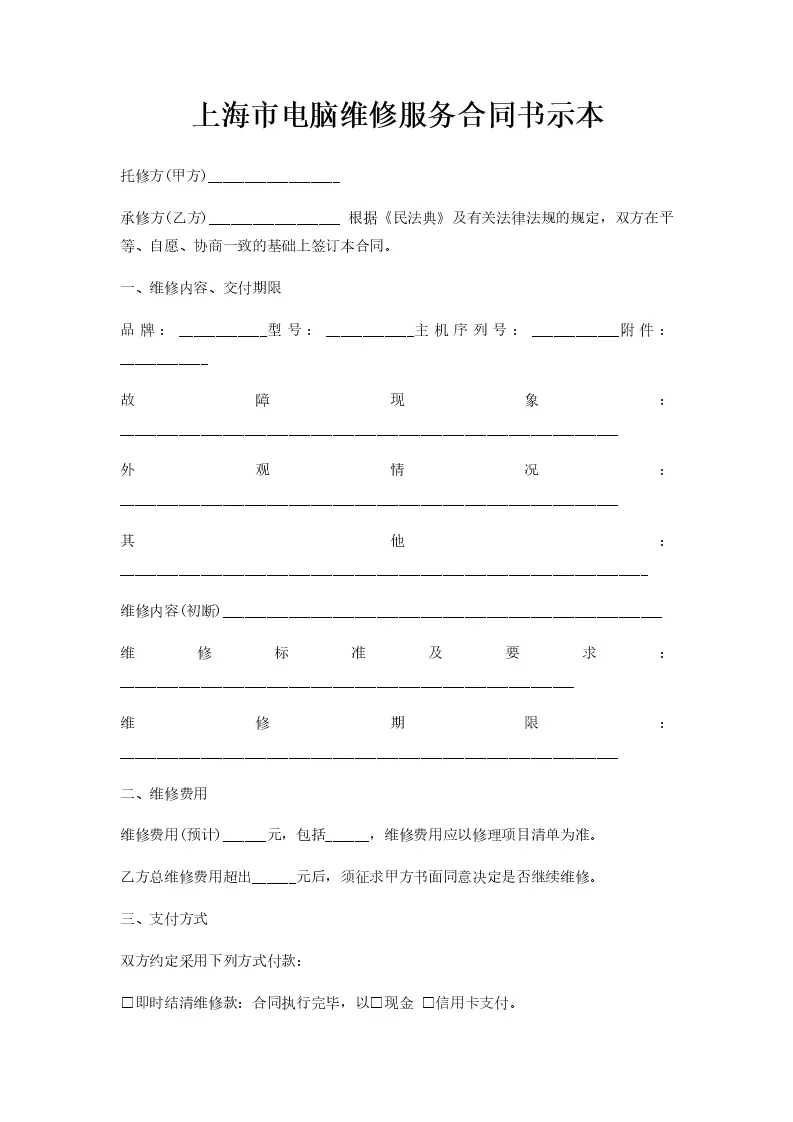 上海市电脑维修服务合同书示本