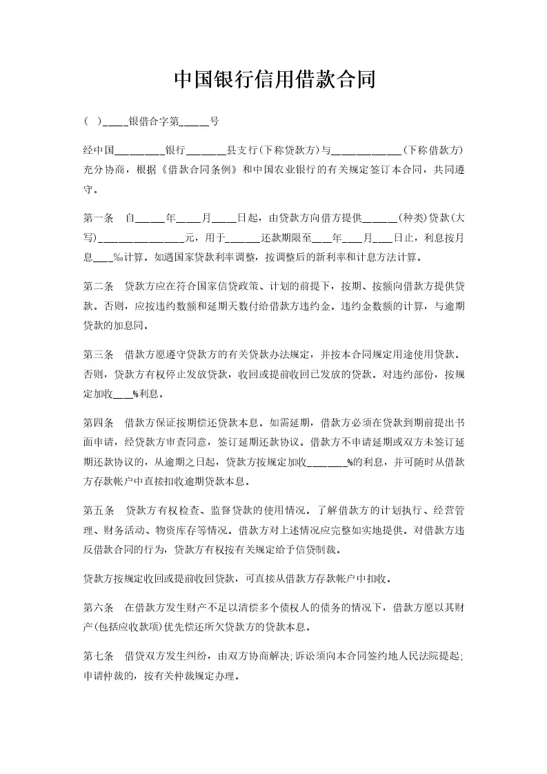 中国银行信用借款合同
