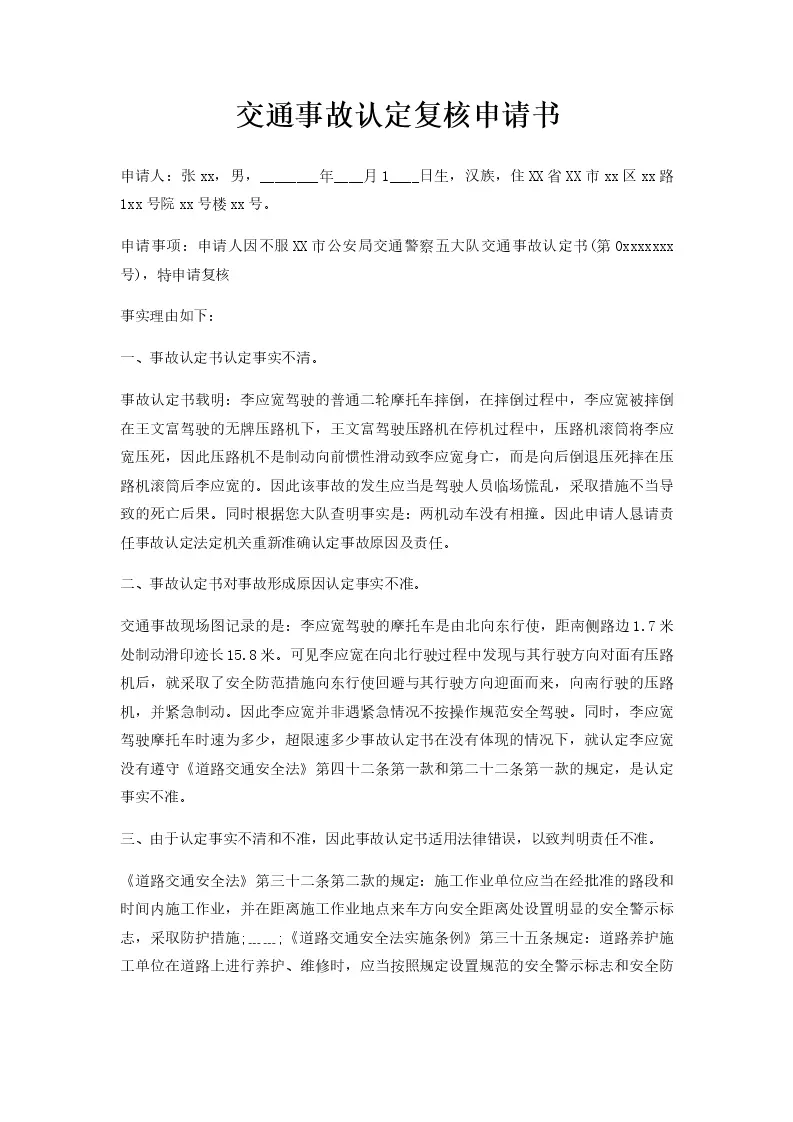 交通事故认定复核申请书