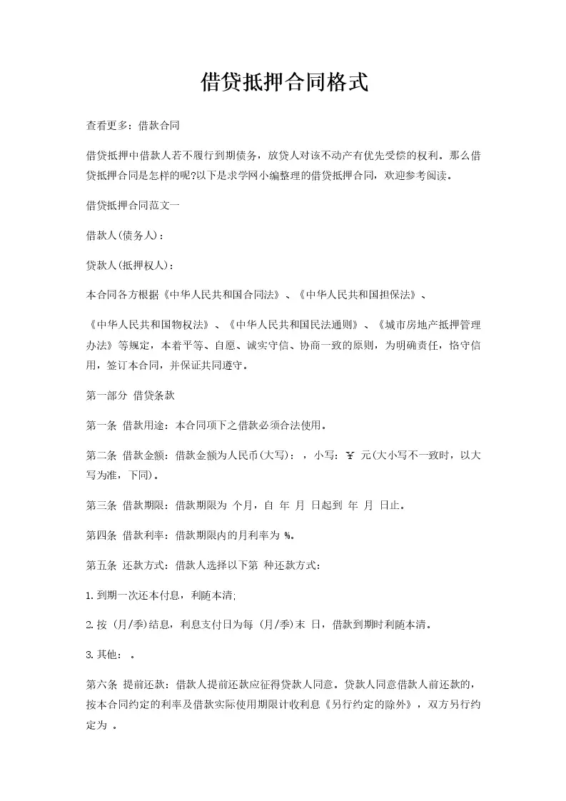 借贷抵押合同格式