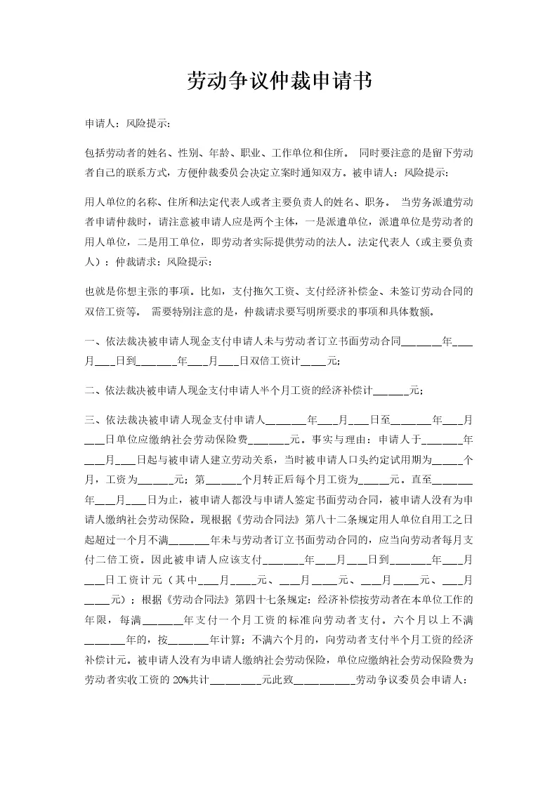 劳动争议仲裁申请书